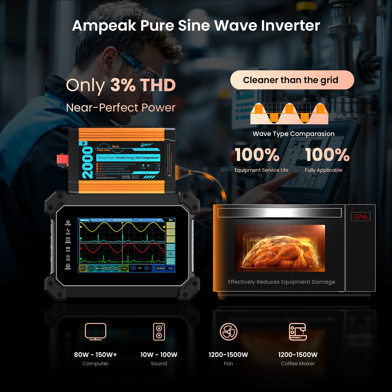 Whether you need to power sensitive electronics like laptops and medical equipment or power tools and home appliances like refrigerators and microwaves, Ampeak's pure sine wave inverter can handle it all.