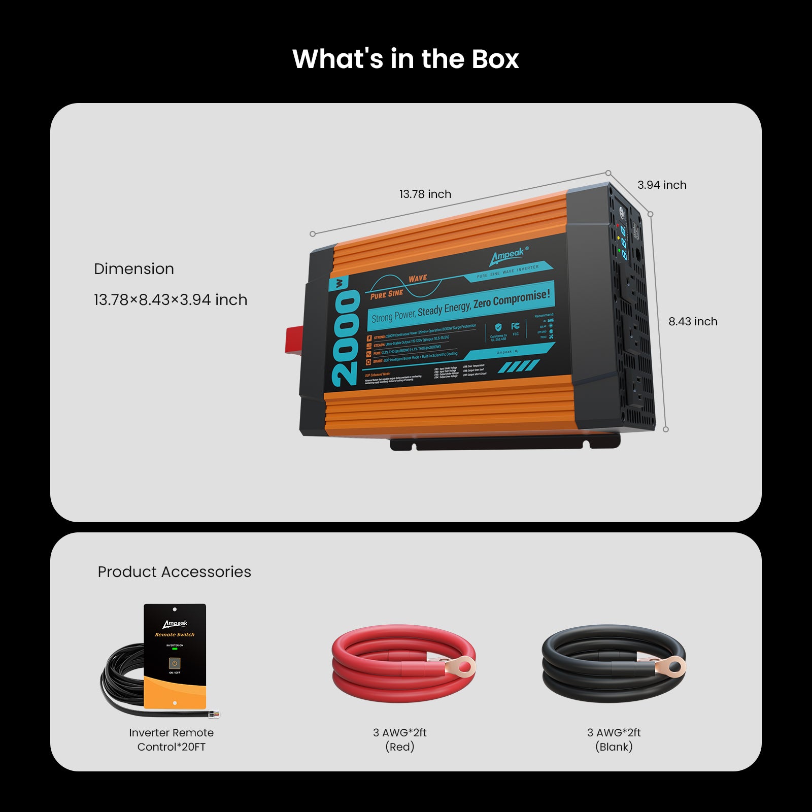 Provides a continuous 2000W of true pure power, overload 2200W, converting your 12V DC battery power source into standard AC 120V power. With 2 USB ports (3.1 amps each), 3 AC outlets, a DC cigarette lighter, and a 3FT 4AWG battery cable included.