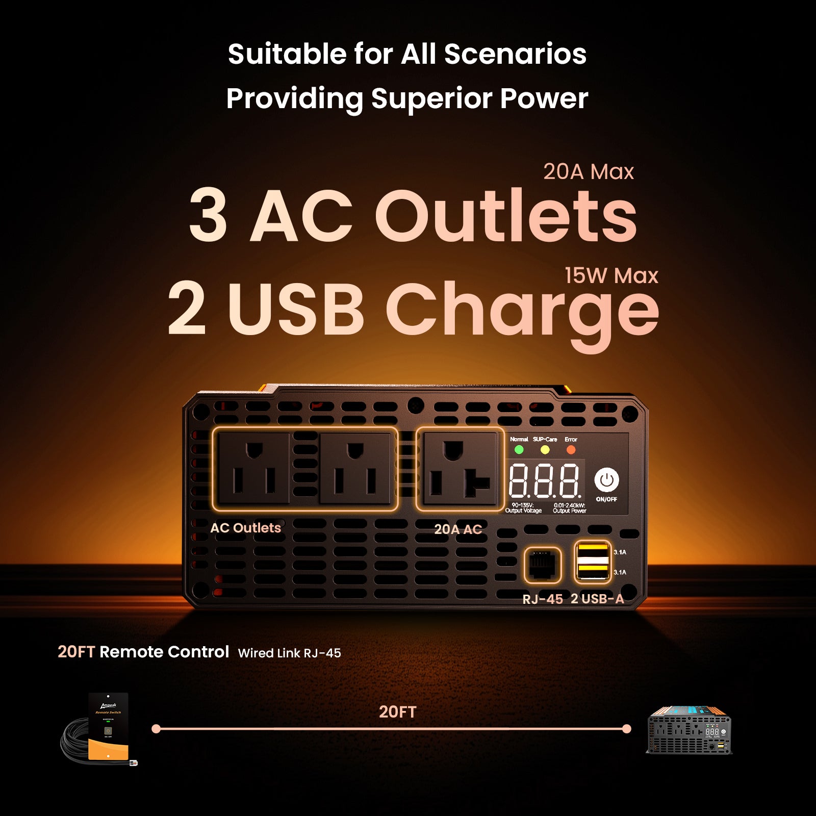 Ampeak 3000W Pure Sine Wave Inverter | 12V DC to 120V AC for RV, Truck, Solar