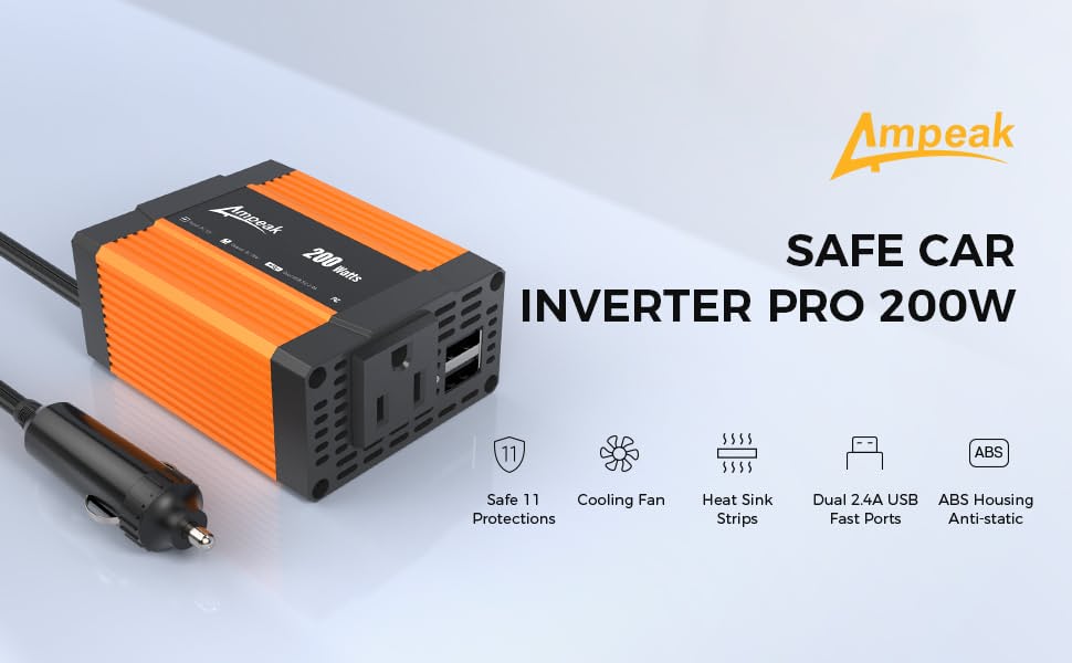 • Stylish Design: The Ampeak Safe Charge 200W car Inverter features a unique and stylish orange design that is sure to stand out. Its high-quality ABS housing is anti-static and provides a good hand feel.